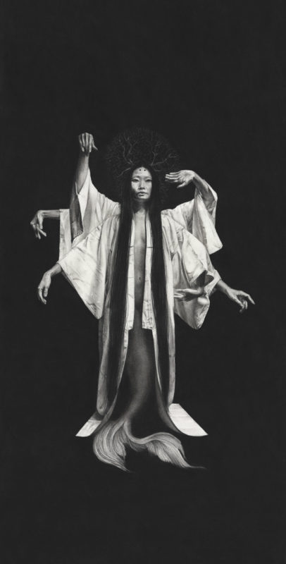 Since I’ve been creating my own mythology with my self portraiture I was looking to find other influences in my life that I could draw from. Harkening back to my cultural roots seemed like the most natural step since my parents are from Japan. I grew up watching Miyazaki films and other Japanese TV programs that always involved myth and folklore. I watched a lot of horror and sci-fi because my parents never censored what my brother and I wanted to watch. It was great.