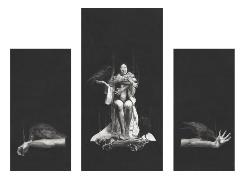 Collaboratively I’ve worked with Allan Amato on his Temple of Art project and a few other subsequent drawings for myself that came out of that process. Integrating his photography into my work opened up a whole new creative language for me to not only collage with Japanese washi paper, but to add acrylic and watercolor into my predominantly black and white charcoal world.