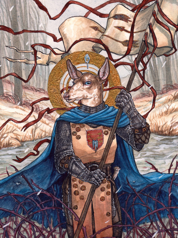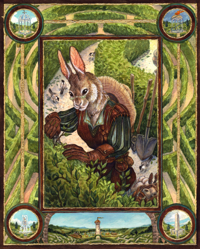 Outside of his freelance work, he has been slowly but surely been illustrating his own tarot deck. The Courtly Beasts Tarot- along with a good deal of Matthew’s other personal work- depicts a fantastical world populated by anthropomorphic animals in elaborate costume, set within lush environments both botanical and architectural.