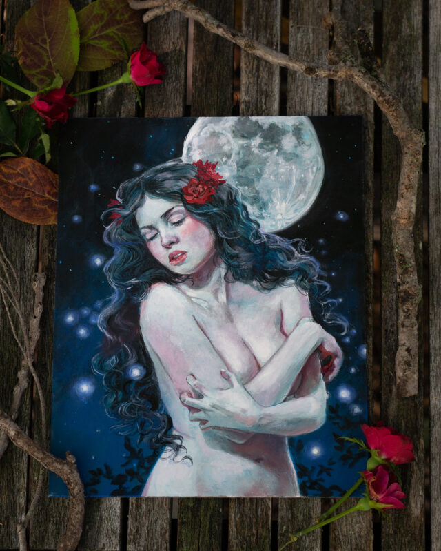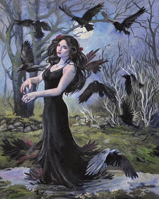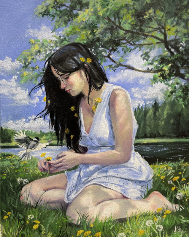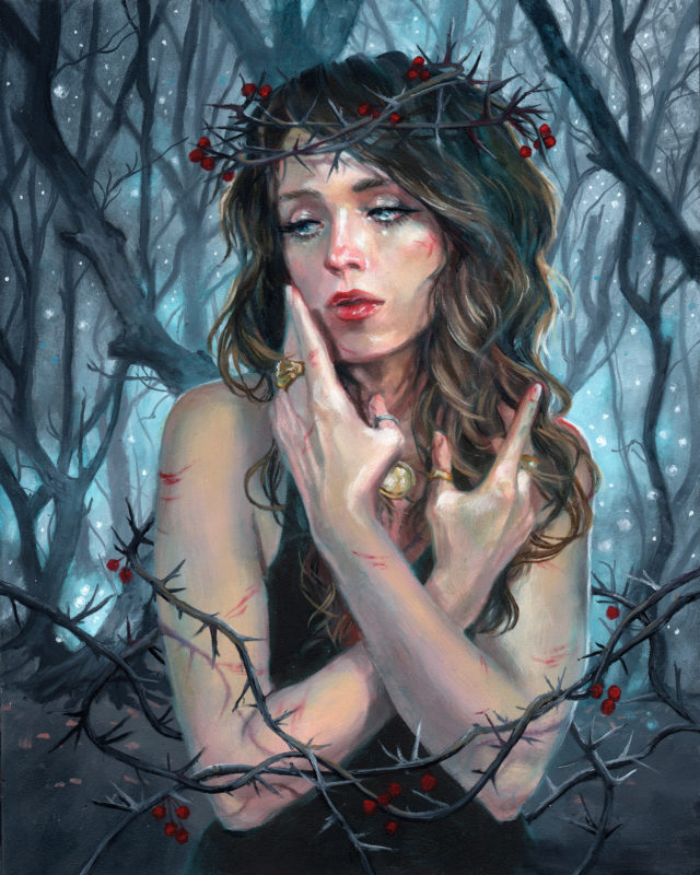 The work of Jennifer Hrabota Lesser explores the edges of discomfort while maintaining the serene and and calm facade expected of modern women. Her work references fables, mythology, social and religious constructs, and where these constructions fail to support the unyielding center. Her subjects are often embattled, finding or losing their own power. They deal with what the unconscious conveys beyond the armor of the exterior, and the need to cover up the unseemly with something beautiful.