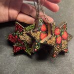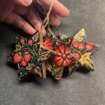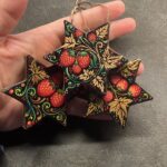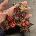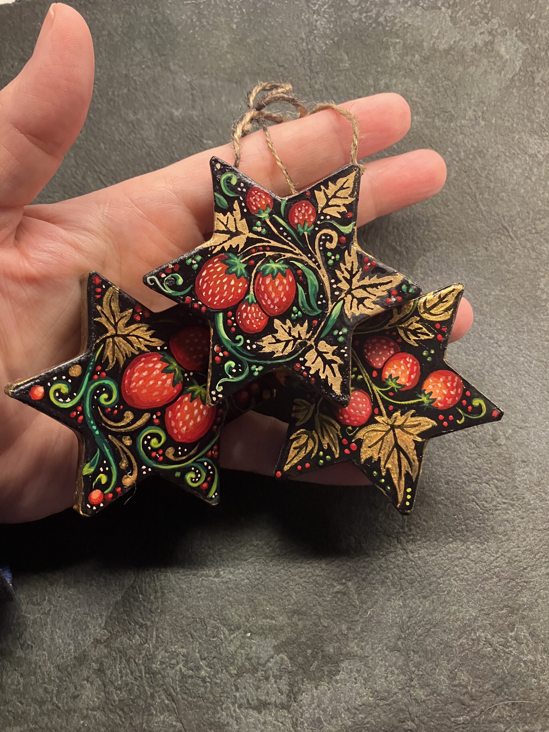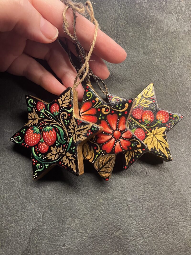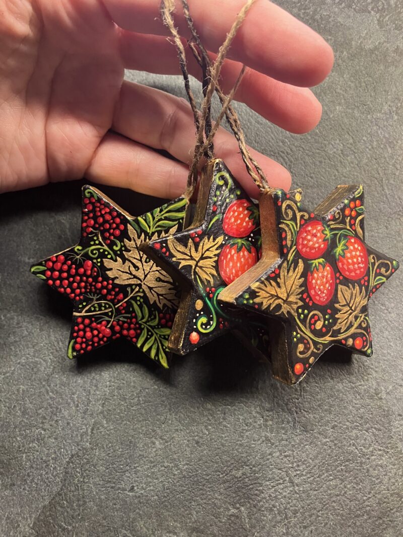They are made in papier maché and are painted with gouache on both sides with bright and colourful designs mainly inspired by russian khokhloma and protected by several layers of varnish. They are of course signed and look good on a xmas tree (I decorate mine with similar ones, I painted dozens of them), as lucky charms on cupboards etc and they age well!