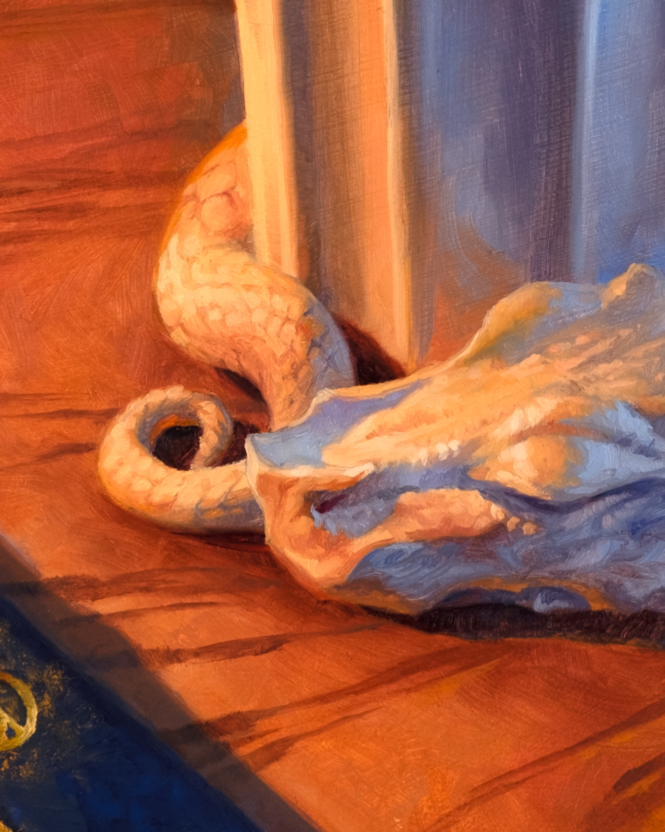 She received her B.A in Drawing and Painting from Dartmouth College in 2013 and worked as a graphic designer for many years, before returning to school at Watts Atelier to train as a traditional oil painter. She taught at Watts from 2022-2025. She has worked commercially for clients such as Upperdeck, Hit Point Press, Draco Studios, Palladium Books, Paizo Publishing, and Strange Owl Games. Her work has been accepted into Infected by Art Volumes 12 and 13, and the 2024 and 2025 Illuxcon Main Shows.