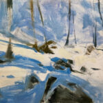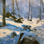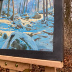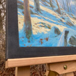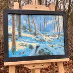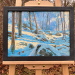 A New Sun, Holland Glen” is an original oil painting, 15″x11,” oil on stretched canvas, and mounted in a handmade black wood frame