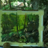 A “splash” of green is perhaps a bit of an understatement. In the early morning I stood in the shade of the early summer leaves, drenched in mosquito repellent. The sun leaped through the foliage and across a large jumble of boulders. It illuminated the once-white canvas in neon green and shifted the hues of the paints waiting to be mixed. Each scrape of the palette knife and each stoke of the paintbrush had to account for this. How would it look at the end of the session, and how would it change on a gallery wall?