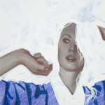 An original oil painting experimenting with techniques and negative space and exploring an original character. Also experimenting with oil enamel paint in large areas which adds a different texture and shine.