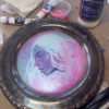 “Alucinari” is a layered mixed media painting created with acryla gouache, layered resin, and glitter housed in an antique silverplate dish, measuring 8″ across and ready for hanging.