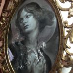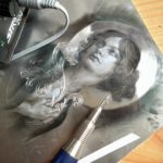 Continuing my exploration of painting on metal, the goal here was to give the piece the feel of an antique, black and white, duragotype photograph. To achieve this, graphite and oil paint were the medium of choice. And the oil paint blended beautifully with the graphite for a soft feel. When experienced in person the reflective surface of painting changes appearance depending on viewing angle and light, the way an antique photo would. To further this experience, areas of the metal were polished, and other areas were engraved through the painting in a pattern that mimics the frame that surrounds it.