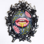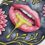 “Amatory” is an original watercolor painting on 140 lb hot press watercolor paper measuring 3.25″ x 4,” sitting inside an antique metal frame measuring 4.5″ x 5.5″ with velvet backing, retrofitted to hang on a wall. The lips and yellow fronds have a yellow gold iridescent shimmer.