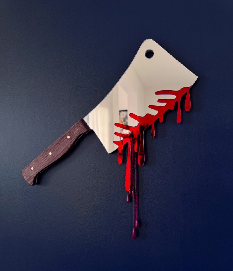 It’s larger than the cleavers we have in the butcher shop, measuring 14 inches long. The blade is 7.5 inches long and 5 inches wide. Including the blood drips – both beaded and acrylic – the height of the piece hanging at the right angle is 13.5 inches. The smooth-finished wooden handle feels very nice to grip.