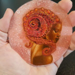 This piece is oil and modeling paste on gessoed Stonehenge Cream Journal paper. She is 4″ in diameter and framed.