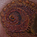 Named because of her resemblance to the fossil Ammonite, that being a derivative of the Egyptian Amun, the horned god. She is a small study in texture, rhythm and color. Her mantle, or horns if you prefer, are intended to look both rigid and flexible…like horn and tentacle combined. A balance of power.