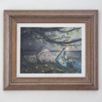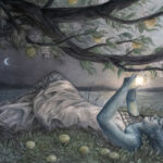 Apples of the Sun is a 10″ x 14″ mixed-media painting inspired by the poem The Song of Wandering Aengus by William Butler Yeats. Materials for this piece include ink, acrylic paint, and colored pencil on Fabriano hot press watercolor paper and is enclosed in a wood frame and ready to hang.