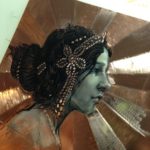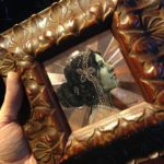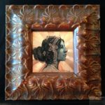 Process: After lightly scribing a sketch on to the copper plate, FW acrylic ink is applied with dip pens and a brush. I then oil paint on top of that underpainting. The final step is to scribe/etch in details,like the jewelry on her headpiece as well as the rising sun background, which will catch the light in interesting ways as you move about the piece. It is a very jewel-like effect.