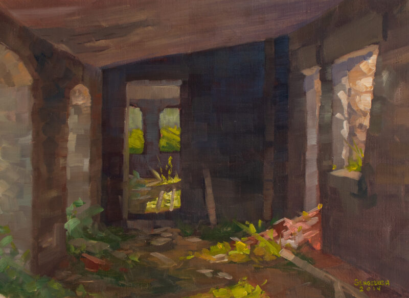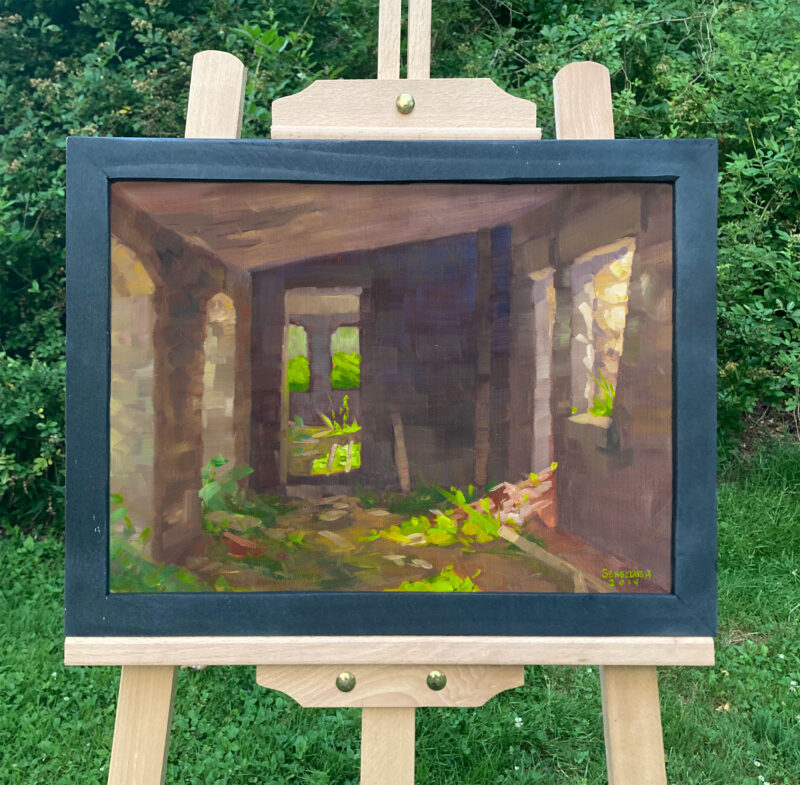 Deep in the hills in Tyringham, MA dwell the remnants of an historic manor. Originally a “Georgian-style” marble palace, little remains of the Tytus-McLennan family’s estate but isolated pillars and cool, shaded cellars. While on a plein-air trip with friends, I found the dark blues of the stone walls a vibrant contrast with spilled orange brick and riotous plants stealing through the interior.