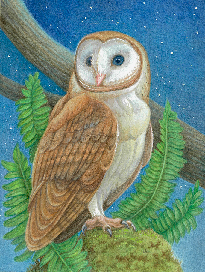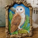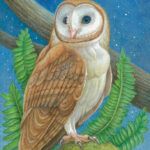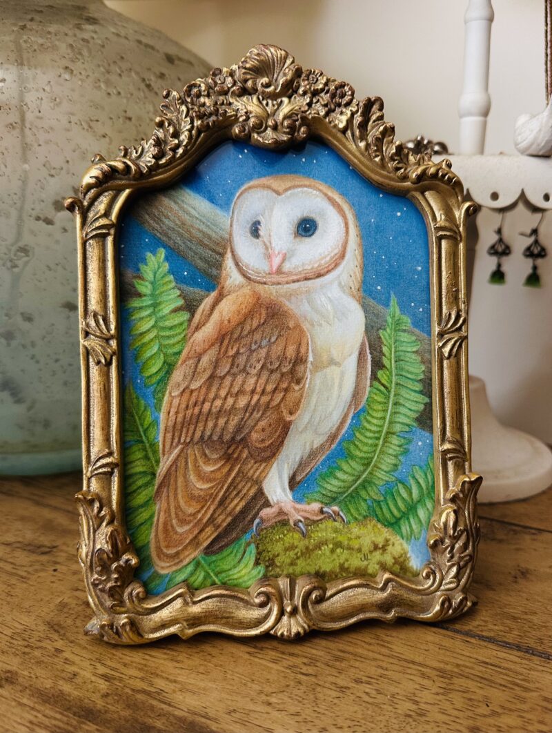 Barn Owl, 5″ x 7″ fit to ornate arched gold frame. Acrylagouache and Verithin colored pencils on hotpress watercolor paper. Sealed with UV protective gloss varnish, signed on front and back.