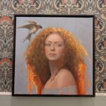 Painted in 2022, in this 18×18 oil painting (framed) a young woman turns, glances over her shoulder, has she caught sight of something just out of view or heard a faint strain of music coming from another room? Caught between moments a swallow hovers, ready to take a loose strand of a red curl to add to her nest.