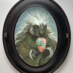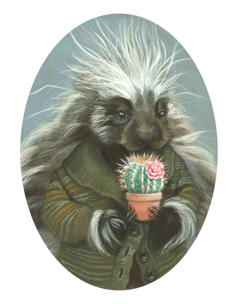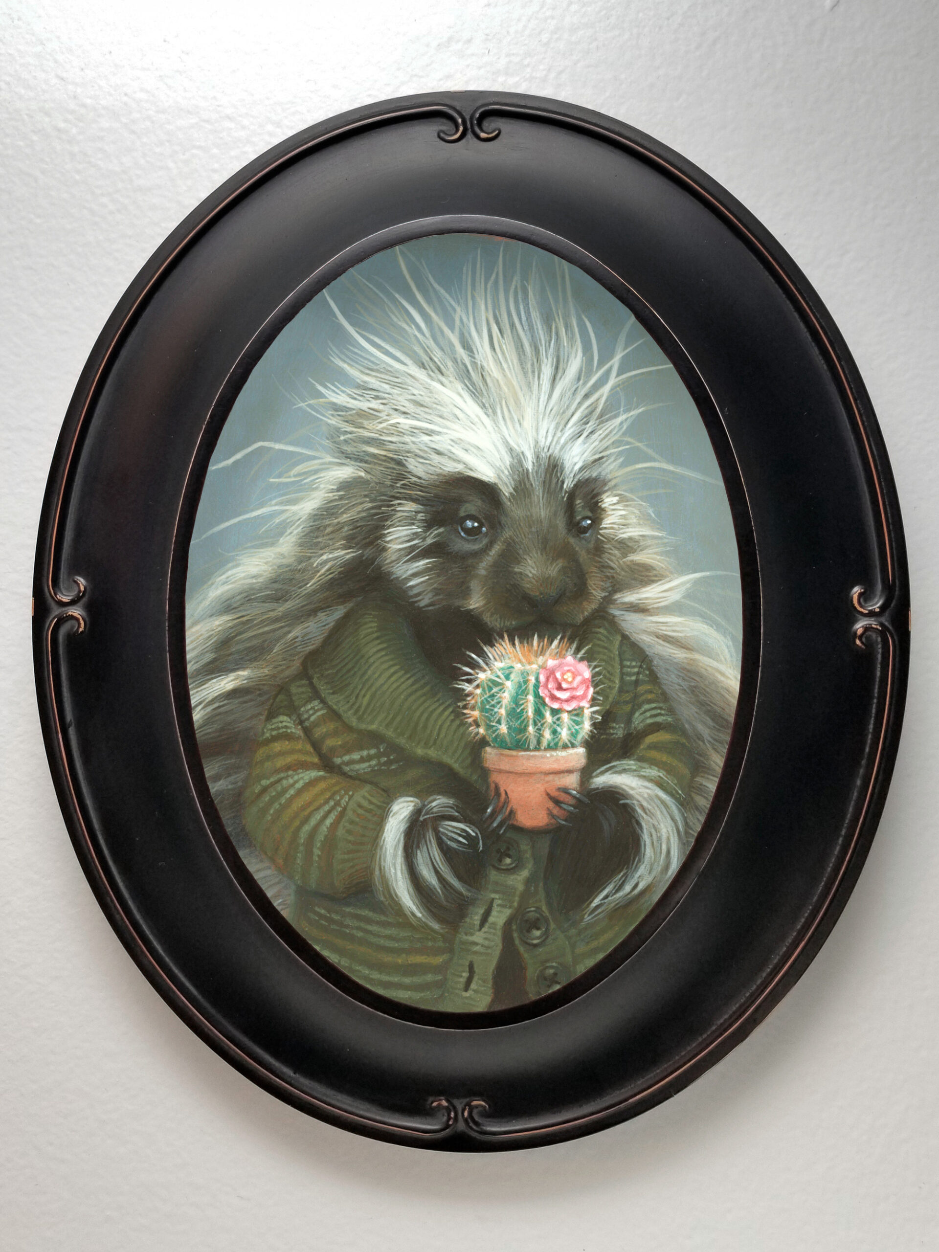 “Baxter”, a 5×7 oval acrylic painting on watercolor paper, is of a porcupine wearing a sweater, holding his flowered cactus. Comes in an oval frame (photo).