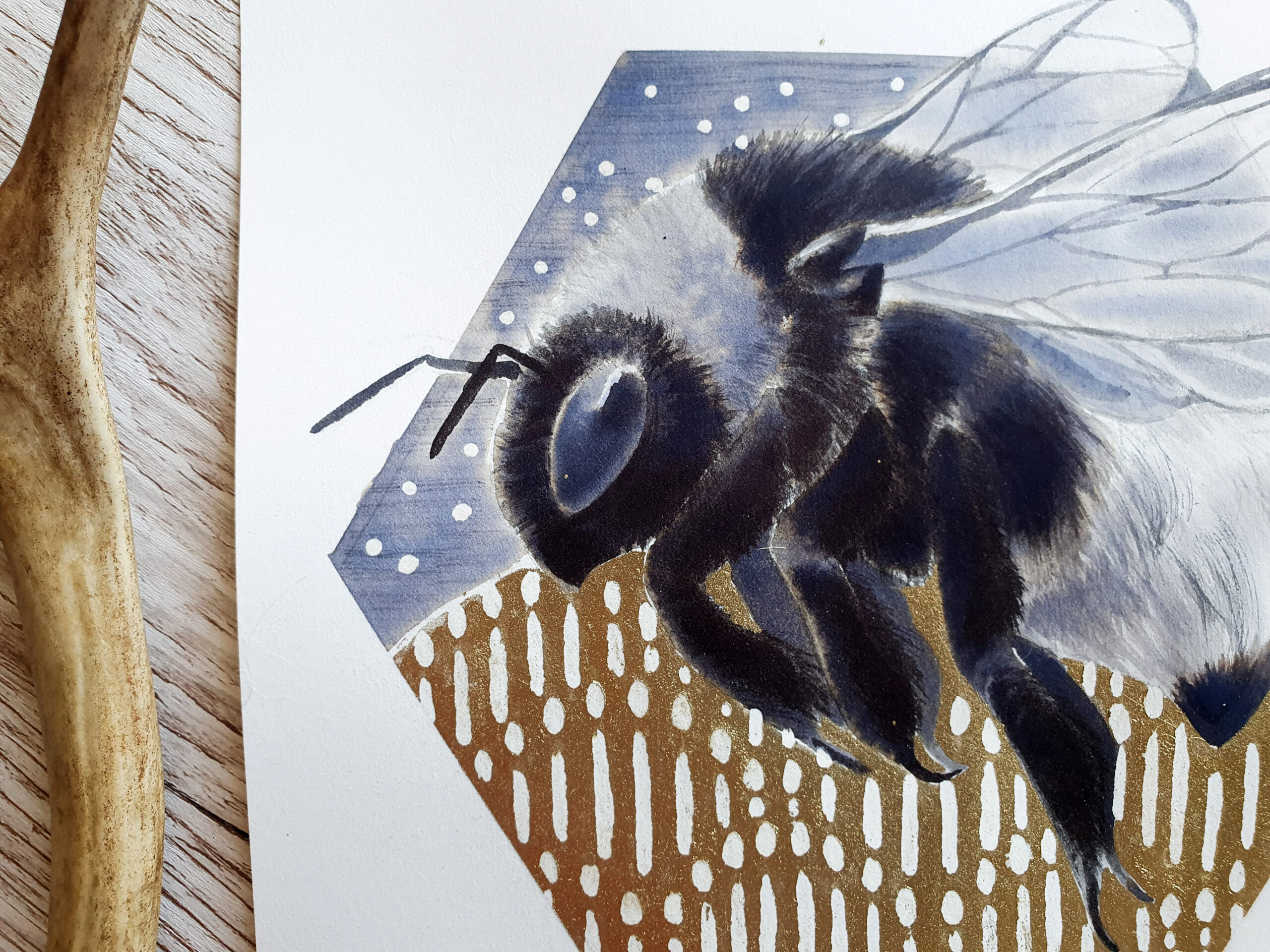 Painted in ink and gold medium on 300 g/sqm Arches hot press watercolour paper. The painting is unframed.