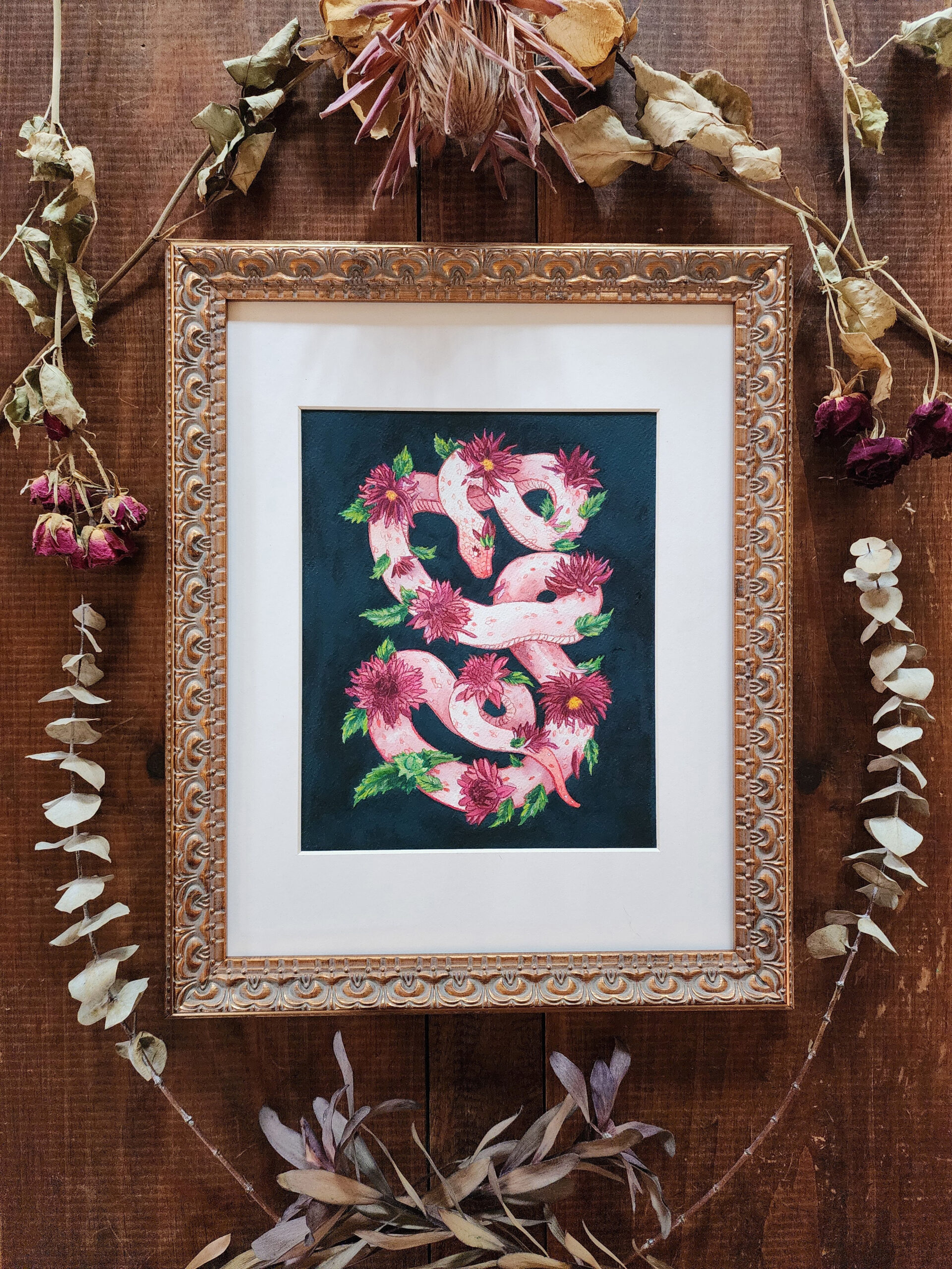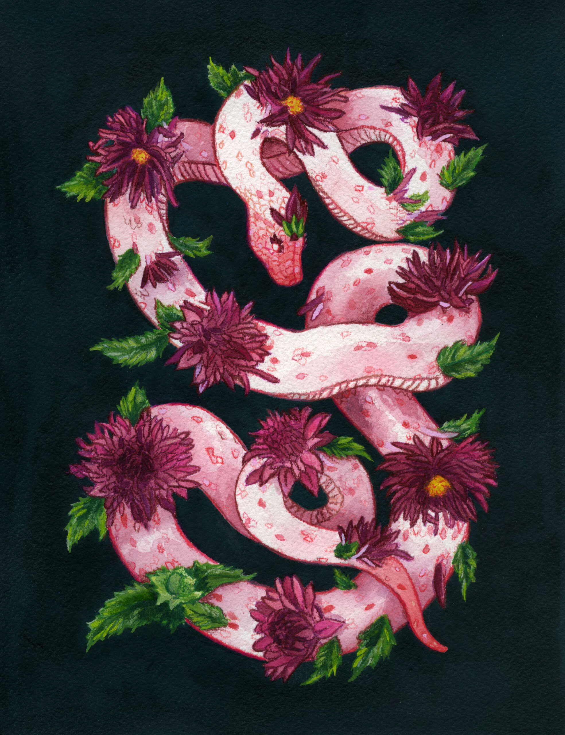 The serpent coiling is shown as a symbol of transformation and rebirth, while the dahlias bloom through its scales, signifying resilience, inner strength, and elegance.