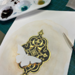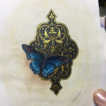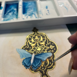 A small Blue Monarque on a Gold leaf and Walnut ink background.