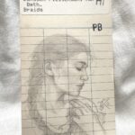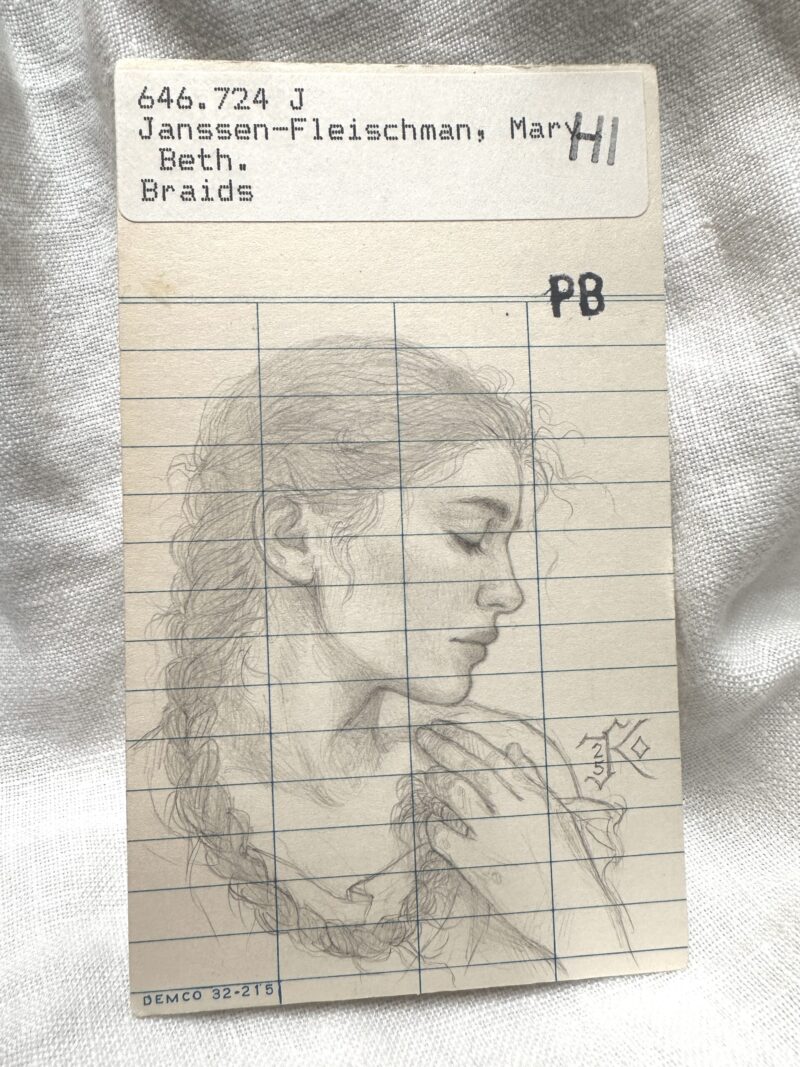“Braids” is a graphite portrait drawing on a vintage library date-due card. The title and subject combination are a bit more on-the-nose than my usual, but occasionally even I can’t resist! Also, please forgive the lack of my usual high quality flat scan image — my computer is on the fritz at the moment and I did my best in a pinch with my phone camera.