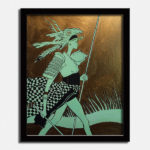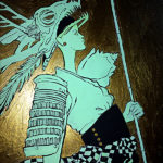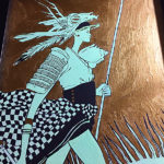 ‘Bronze Sea Priestess’ is a new gouache and acrylic painting measuring 8″ x 10″. The priestess wears a headdress with antlers, a fish skull, and feathers with some other unique costume elements.