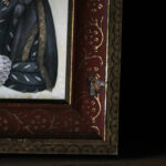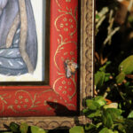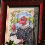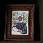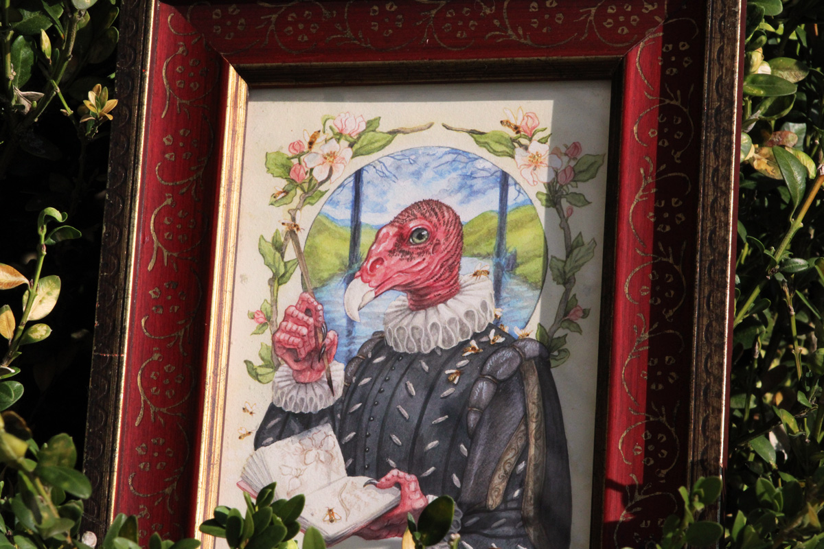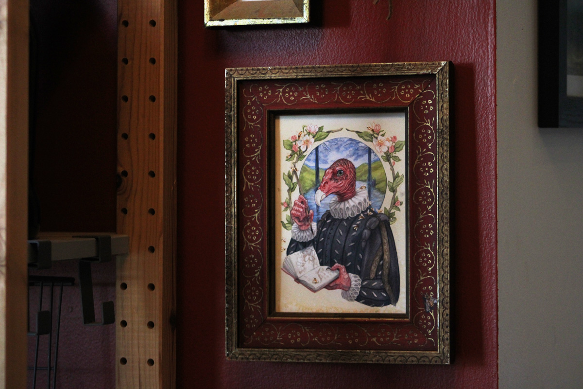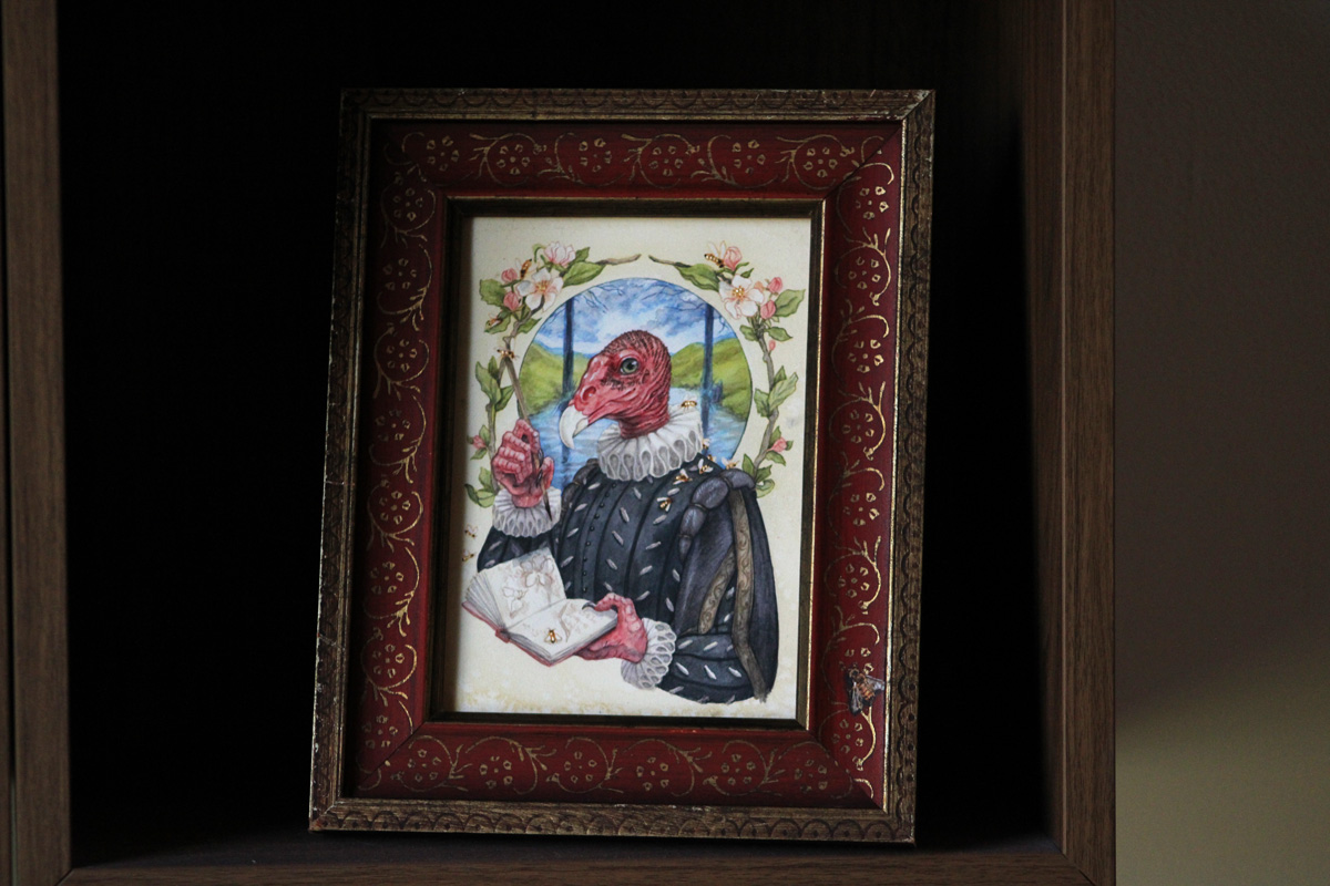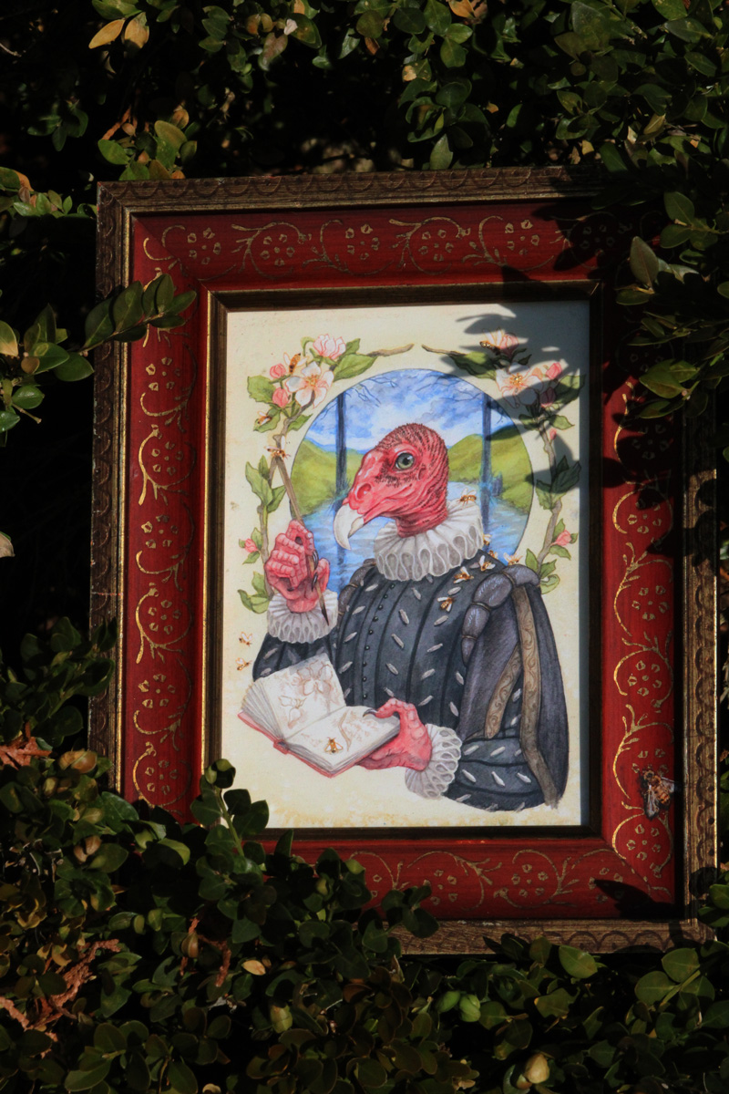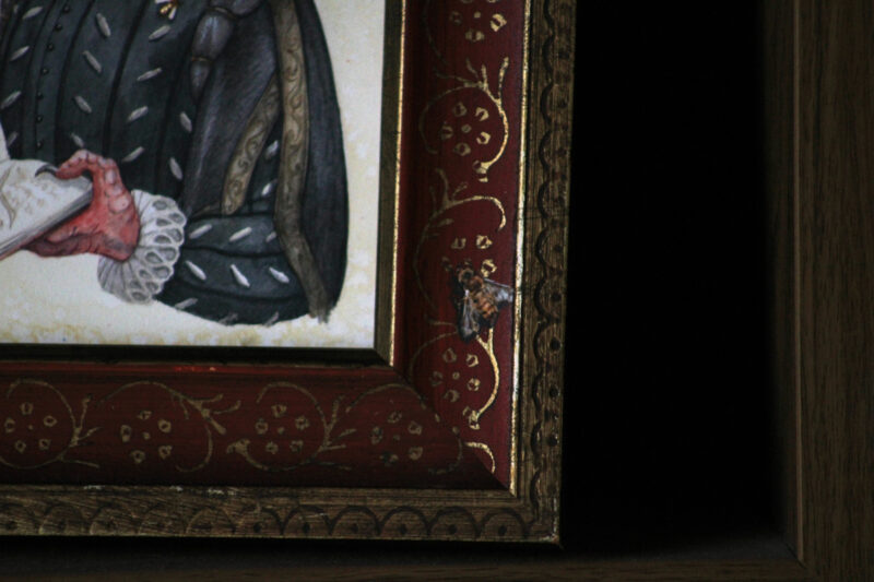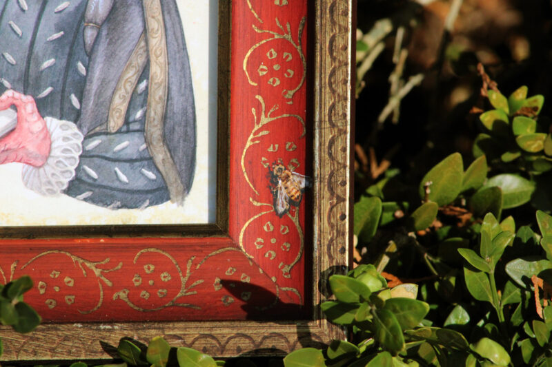Painted in watercolor, gouache and colored pencil on 140lb Arches hot press paper. Accented with genuine gold leaf and framed. The frame is embellished (by the artist) with a hand-painted bee.