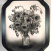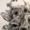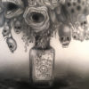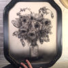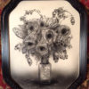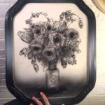 The piece is an original pencil drawing, embellished with acrylic paint using my airbrush to darken the mouths and shadows. I also refinished a worn antique frame (it has a few thin cracks/chips) to give it a smooth grey-to-black fade around the sides. The corners have tiny flower carvings that pair nicely with the piece.