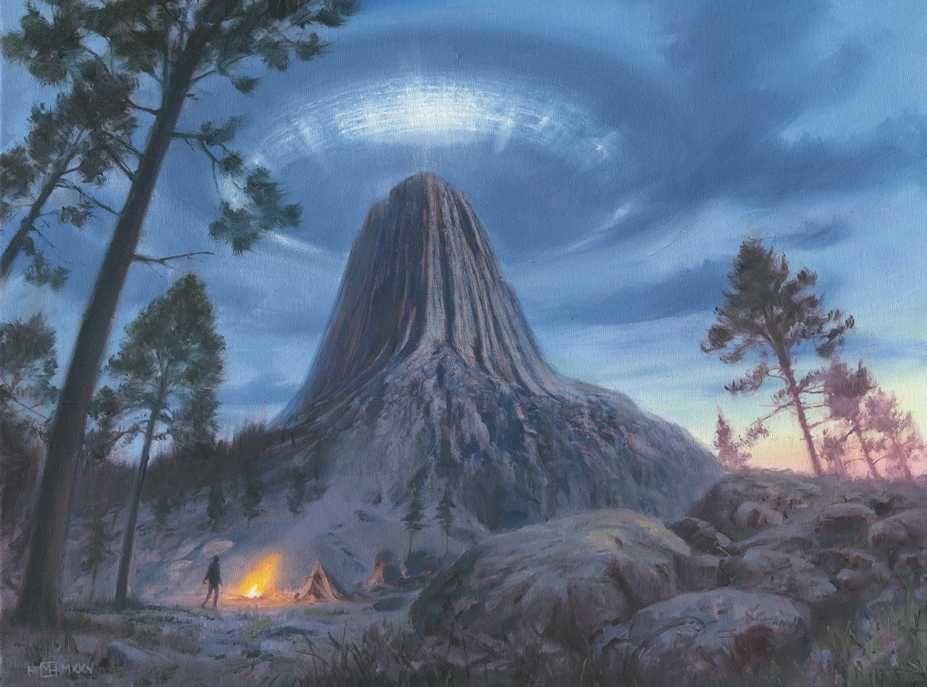 Another of my paintings of well known landscapes from prominent SF movies, in this case Close Encounters Of The Third Kind in which Devil’s Tower, Wyoming is the location of the climax to the movie. In my painting some guy hiking in the area has set up camp for the night and is startled to see The Mothership hovering over the mountain.
