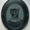 “Charlotte”, a 5×7 oval acrylic painting on watercolor paper, is of a bat wearing a sweater shawl. Comes in an oval frame (photo).