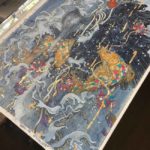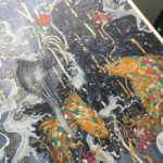The piece started as a black and white ink drawing and it was recently featured in the Sketchbook section of ImagineFX magazine. Watercolors and gouache plus pieces of metal leaf were applied on top of the ink drawing.