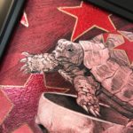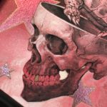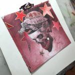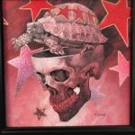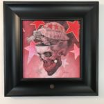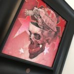 Cranium 3 is symbolic of my slow, steady, methodical approach to creating art. The piece began in Graphite. Followed by silver leafing the background stars. Next we transparently painted over that with red. And finally we worked up the final detail in Acrylic with some gold embellishing.