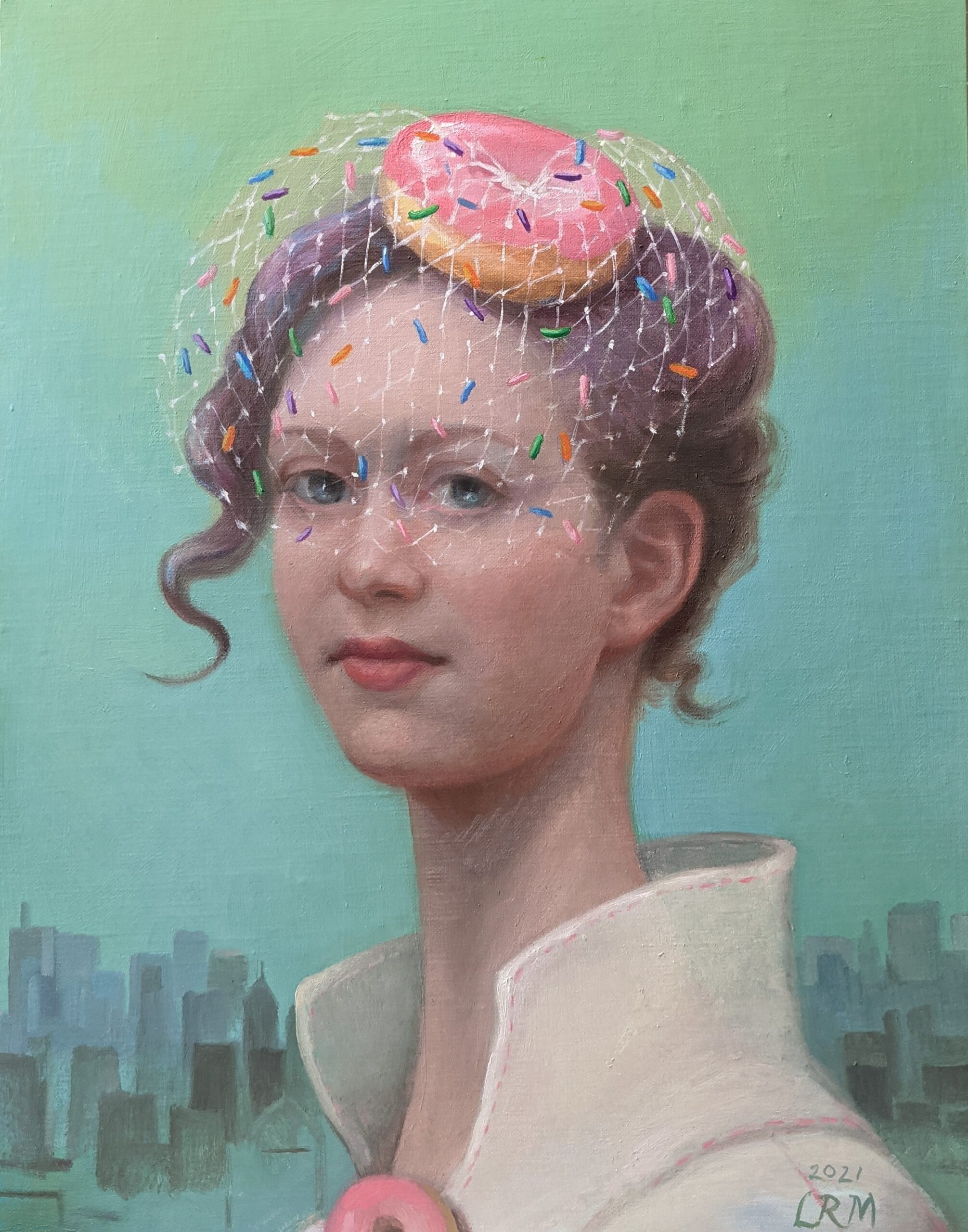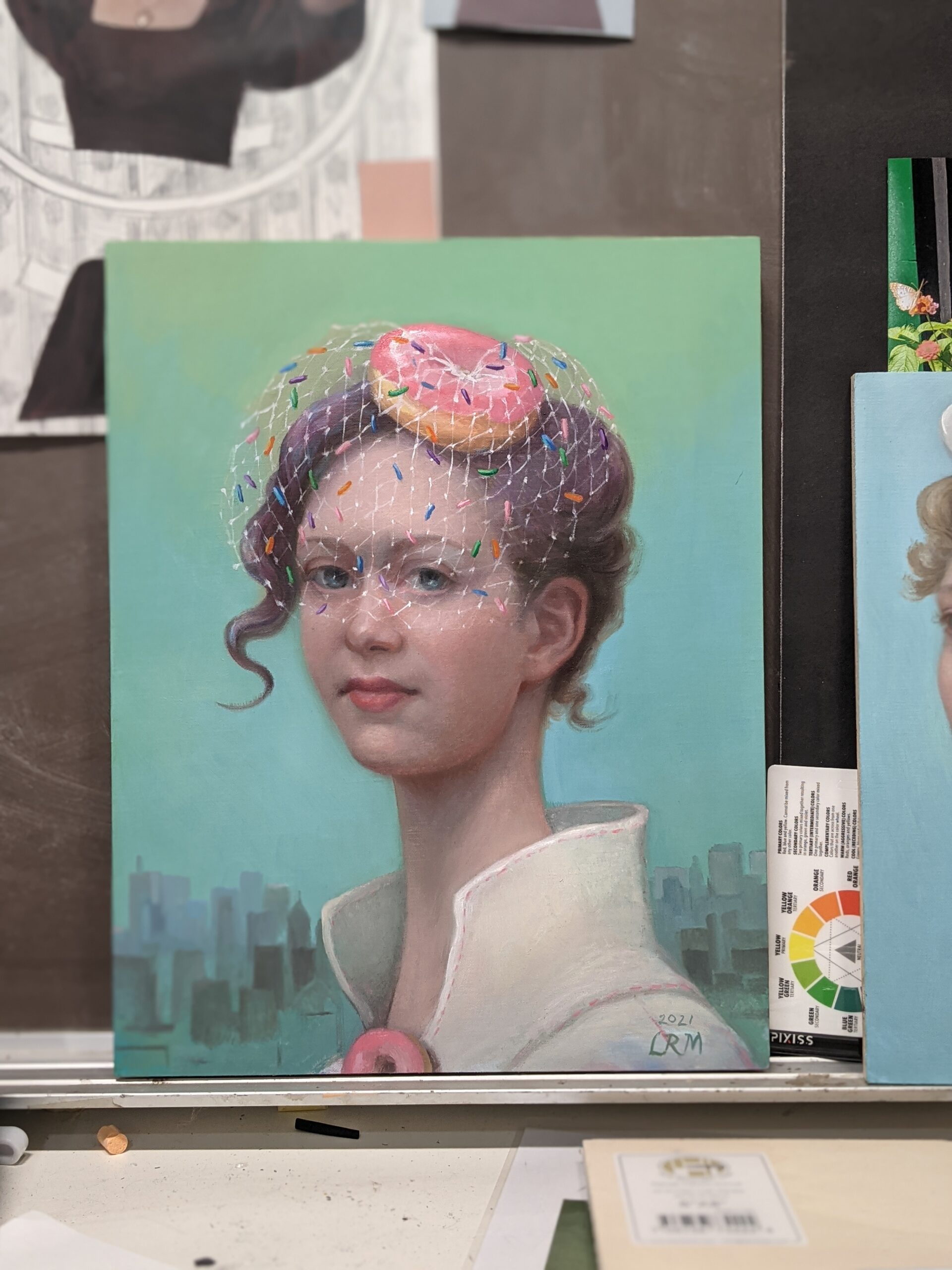 “Doughnut Couture” is a 14×11 oil painting on cradled panel. Part of a larger series of paintings called “the Pastriarchy” by artist Leah Mitchell.
