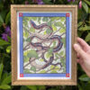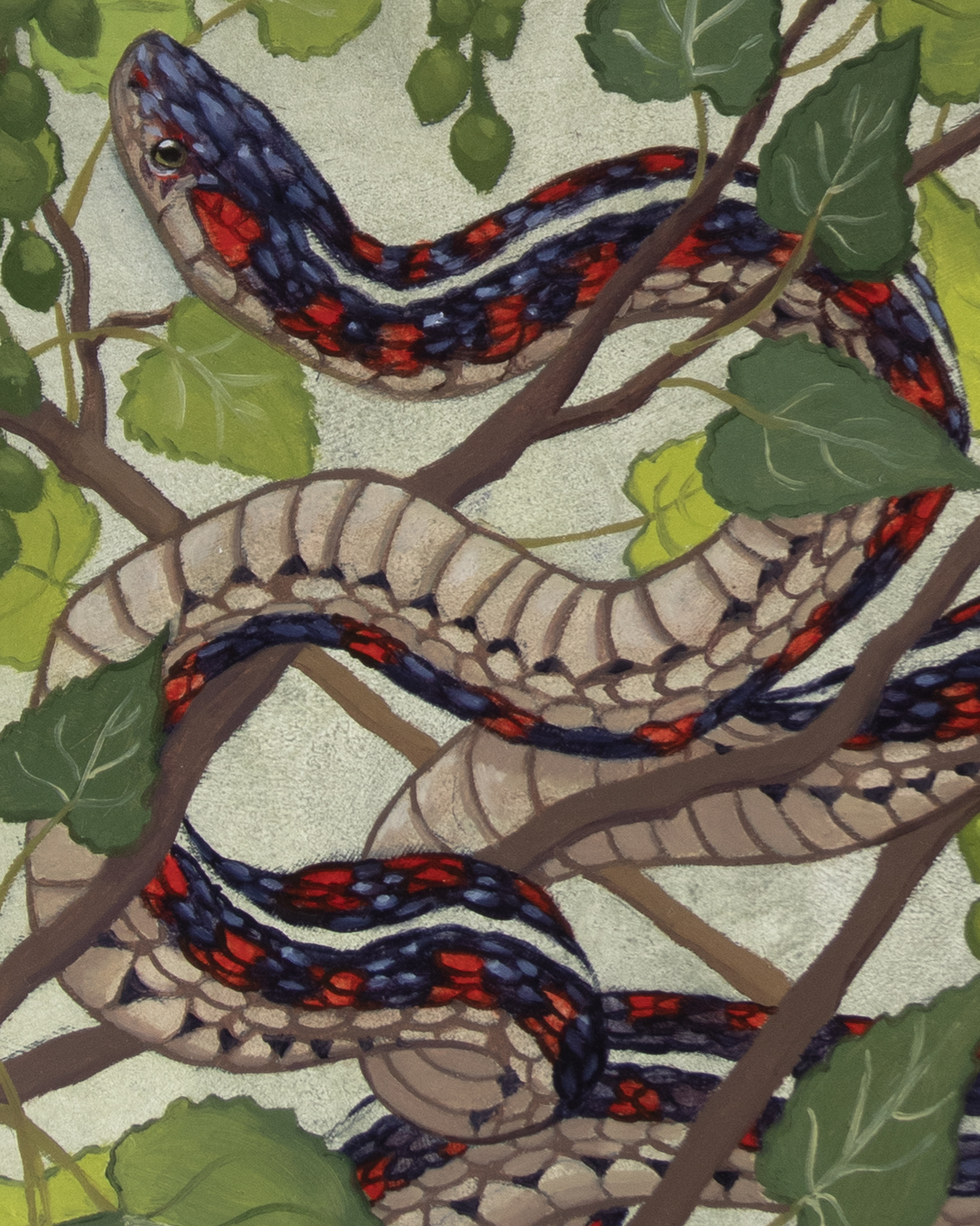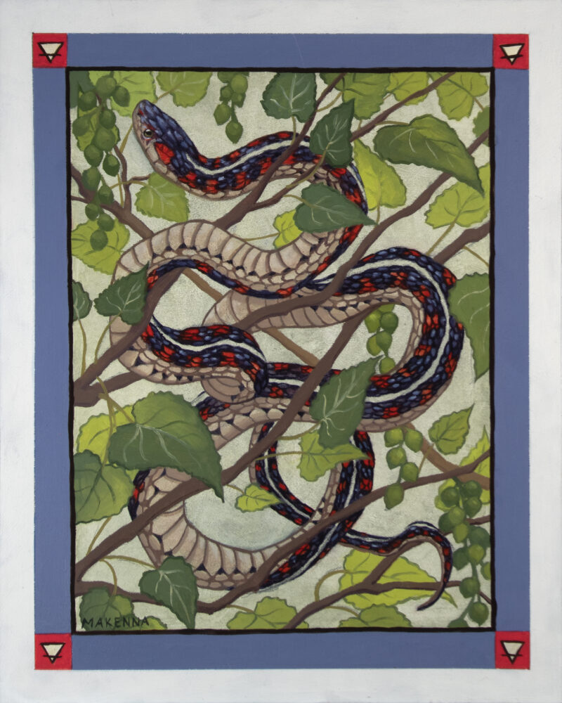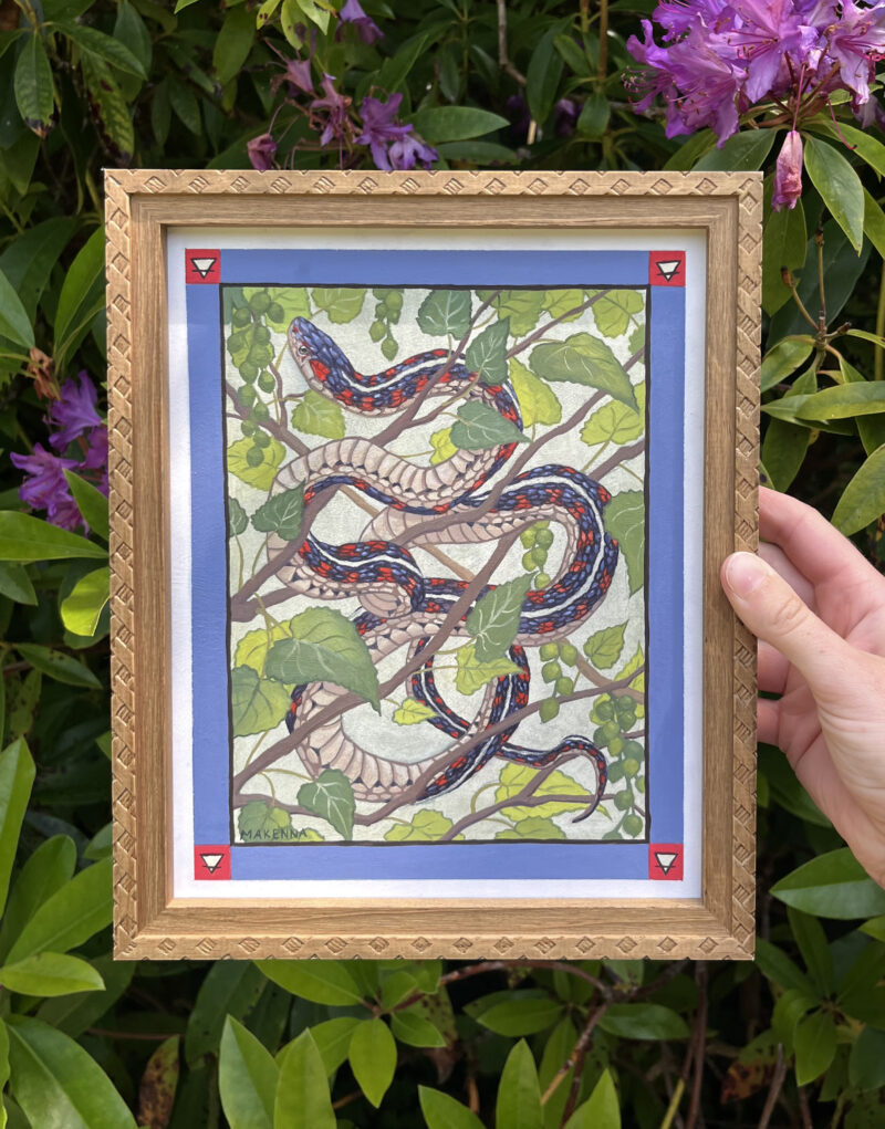 For the second piece in my four elements series, I chose a red-sided garter snake to represent Earth. I called on a few different influences for this piece, including tattoo art, stained glass windows, and a childhood spent looking at cottonwood trees in Kansas.