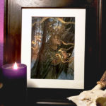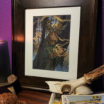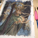He works primarily in ink, watercolor and gouache (often embellished with metal leaf), creating pieces inspired by folklore, history, and nature.