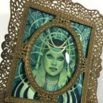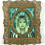 “Empress” was created with watercolor and finetec gold pigment, and is housed within an antique filigree metal frame with convex glass. The frame measures 5″ x 6″ and the painting within measures 3.75″ x 4.5.”