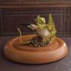 Crow skull is made from hand-dyed cut wool, mounted on ballast with wool ferns. Displayed under 4″h glass dome on oak base.