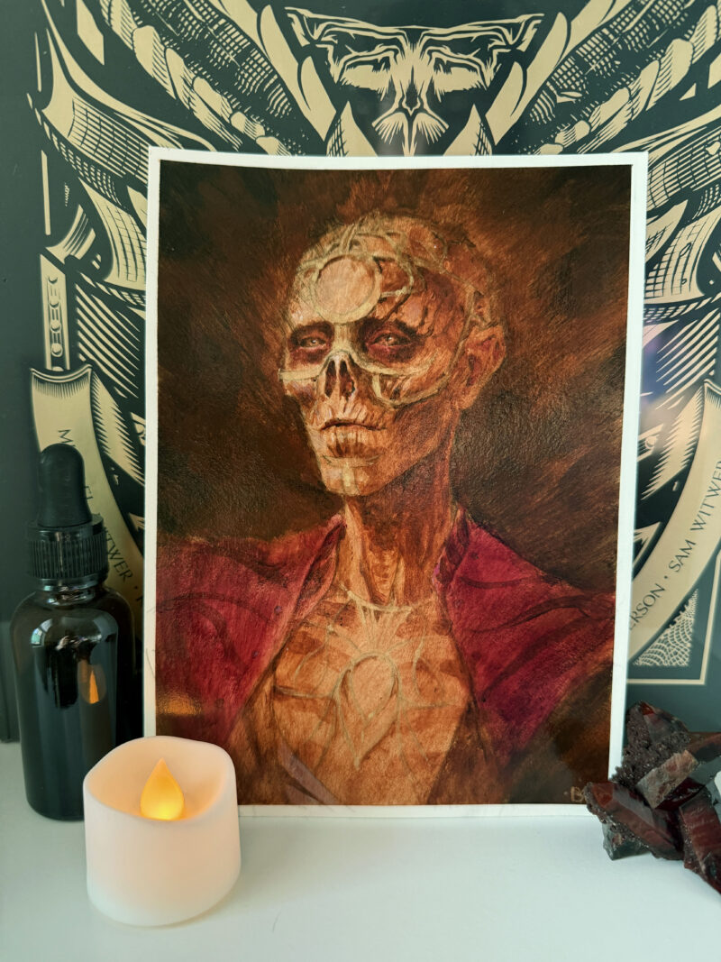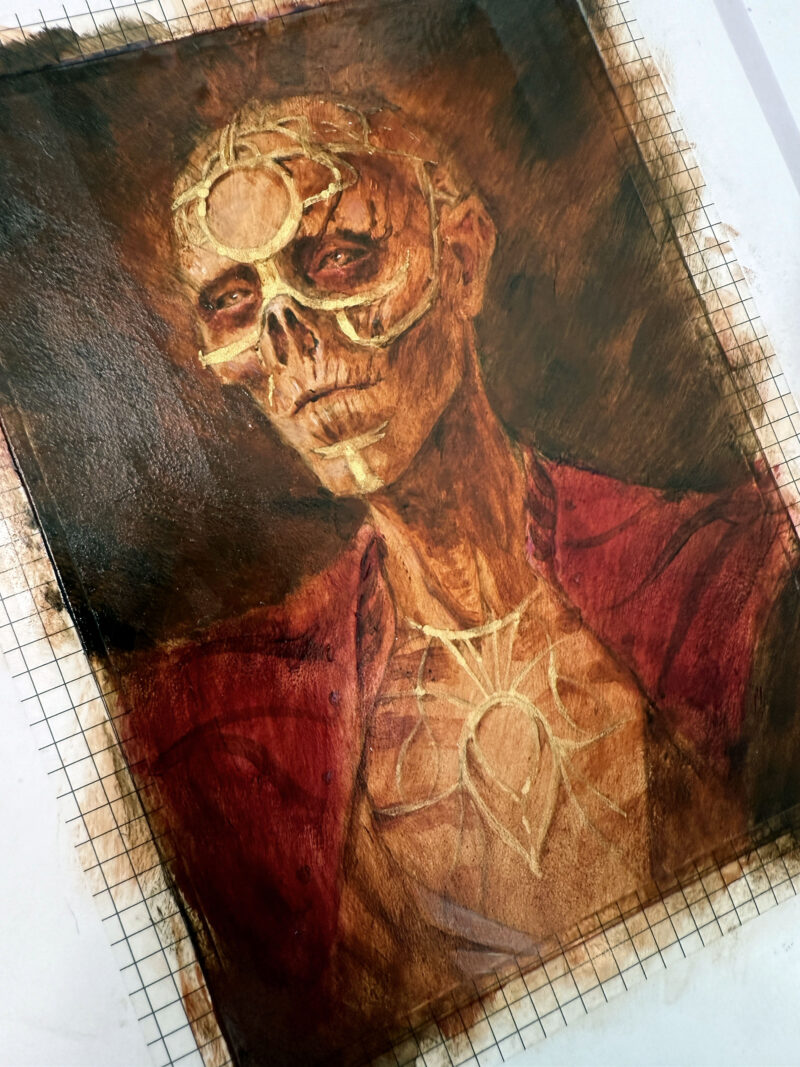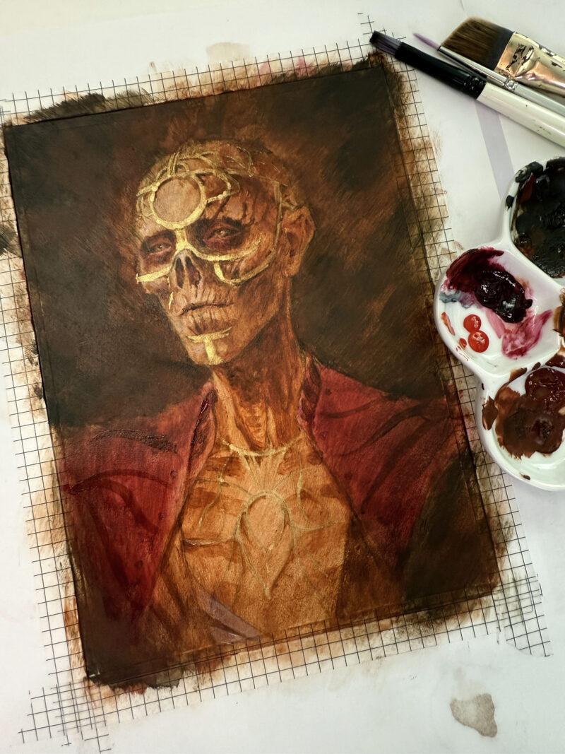 Gilded in gold ink fit for a god, this painting was created in Golden acrylic paints on Arches hot press watercolor paper.