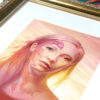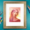Original watercolor and colored pencil piece on watercolor paper in a gold frame with a white mat.