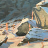 One of the first, best painting locations I’ve yet found is in Irving, MA, at the Farley Ledges. Folks familiar with my work and the history of climbing in the area will recognize some of the most famous boulders in Massachusetts, subjects I never get tired of painting in any season. I love how in the evening, the sun begins to drop behind the cliff band, casting the steep rock walls in blue shadow, while snow and vines lead the eye to the bright warm tones of the jumbled gneiss. I began with a plein air sketch (seen here in the gallery), then developed it into this 48″x24″‘ painting. The original underpainting was completed in cadmium orange and alizerin crimson, and occasionally peeks through the foreground snow, making the whole piece seem to vibrate.