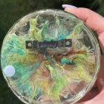 this painting is a 4 inch circle of resin and is about 1.5 inches thick. I attached a sawtooth bracket to the back for simple and seamless hanging