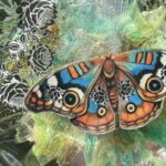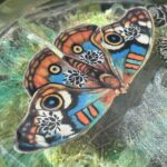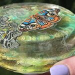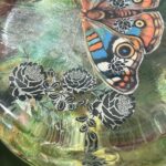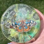 This little beauty is a mixed media painting made with Art Resin, Alcohol inks, Skeleton leaves, washi tape, and waterproof paper. The butterfly is a hand cut print of one of my own past paintings, each is hand-embellished with acrylic paint to give the butterfly more dimension.