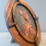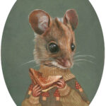 “Flynn”, a 5×7 oval acrylic painting on watercolor paper, is of a field mouse wearing a mushroom sweater, eating a grilled cheese sandwich. Comes in an oval frame (photo).
