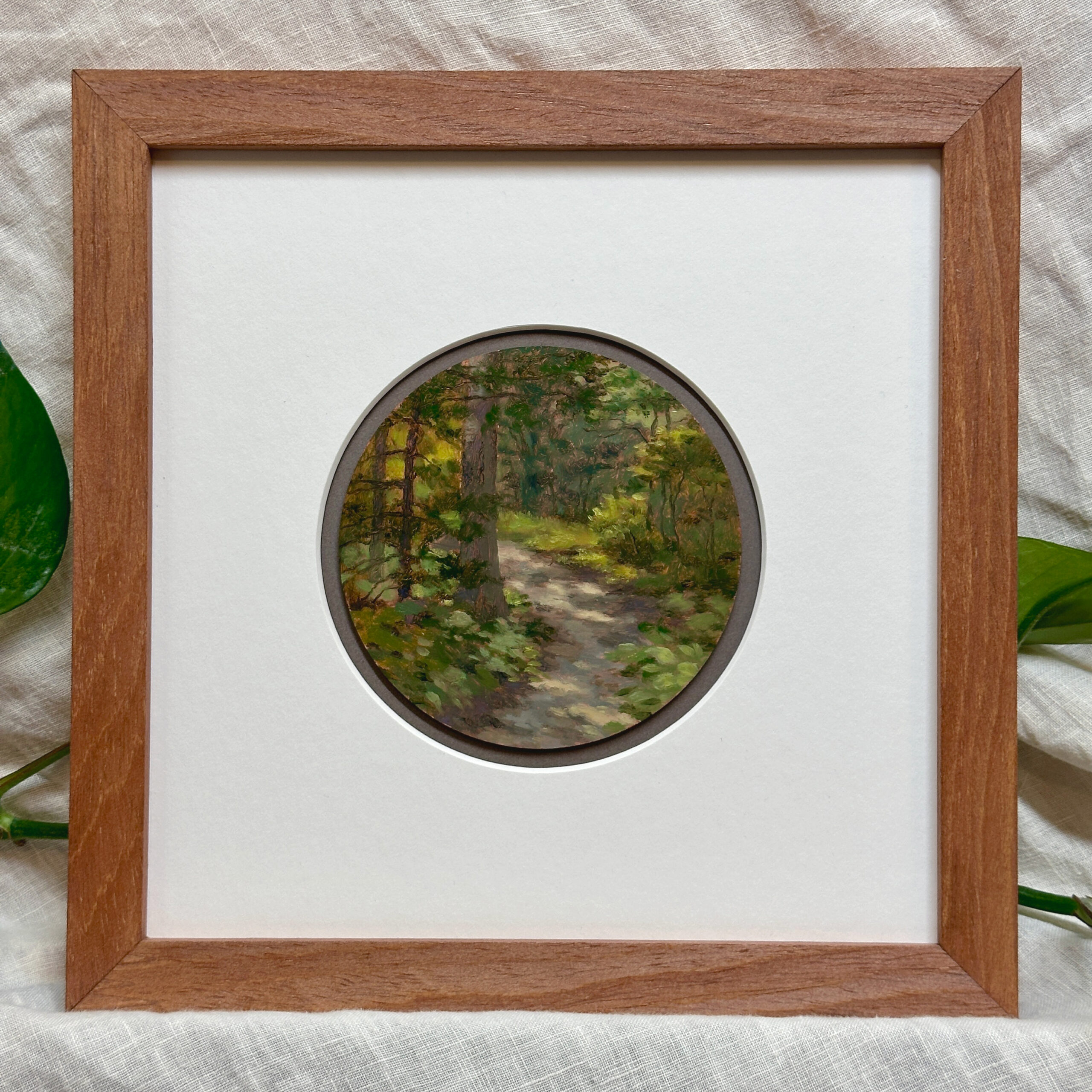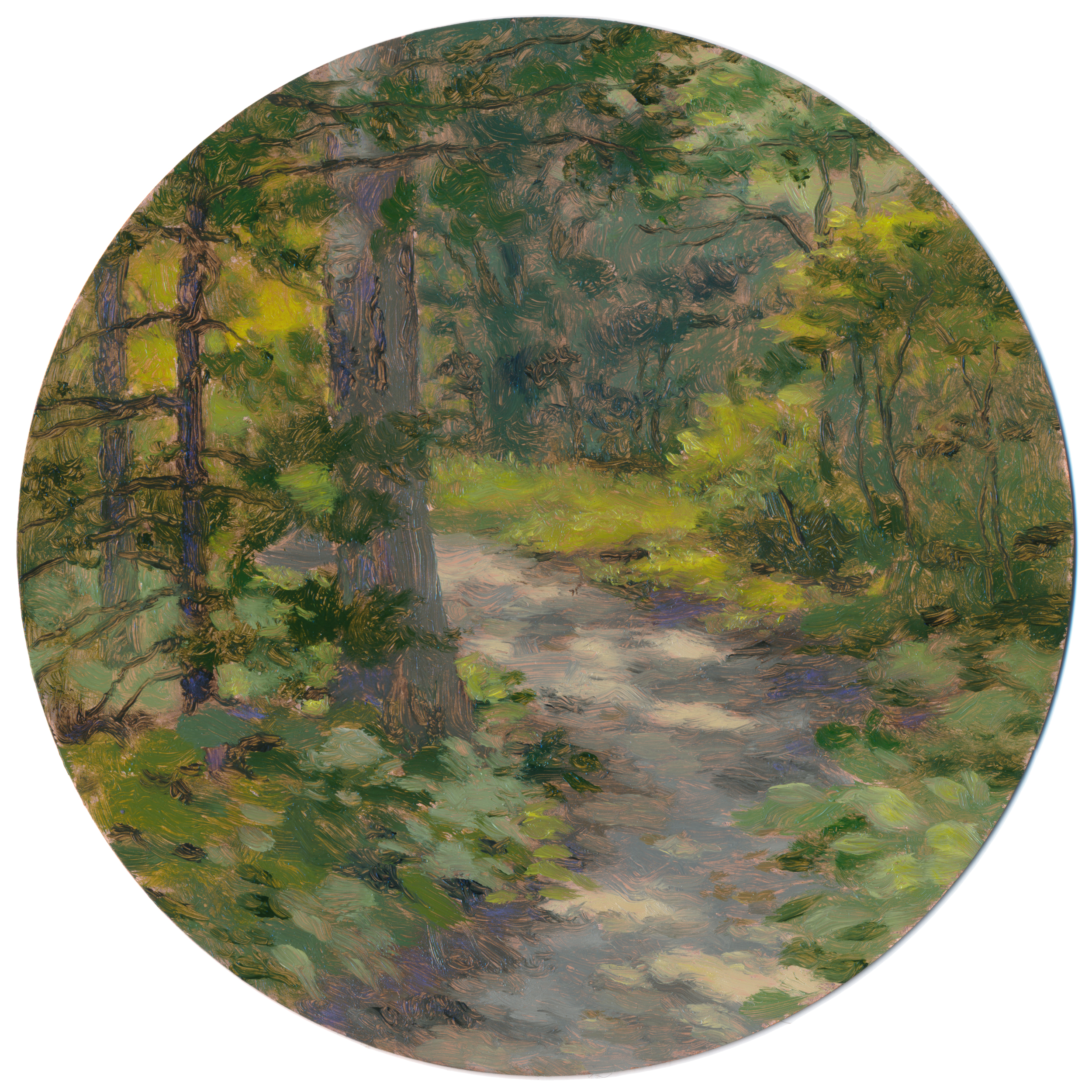 It happened: I got bit by the plein air painting bug. “Forest Path” is a 4 inch round oil painting on copper, painted on location from life this summer at the UNCA Botanical Gardens in Asheville, NC. Copper is a unique and very special substrate, because you can paint directly on it with oil paint and it is perfectly archival. The copper adds luminosity to the paint, and where tiny bits of it are exposed here and there, it glints and shifts in the light when the painting is viewed. It’s truly a magical effect! The painting is varnished to protect the paint and preserve the shine of the copper.