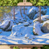 Mount Toby is a cozy kind of mountain, rising only 900 feet above the surrounding forest. It straddles the border between the towns of Sunderland and Leverett. Trails scribe the mountainside from Cranberry Pond in the north to the fire tower and the sugar shack ruins in the south. Follow them east and down to find the Roaring Falls. A series of cascades and pools carve through conglomerate cliffs. This morning, however, the Falls were silent, frozen mid-leap in swirls of cerulean and purple. Rock faces peek through a thick blanket of snow. It was too cold even to paint, but I wandered around taking photos and drawing sketches. I know that I’m looking for the right contrasts of light and shadow, simplicity and complexity.