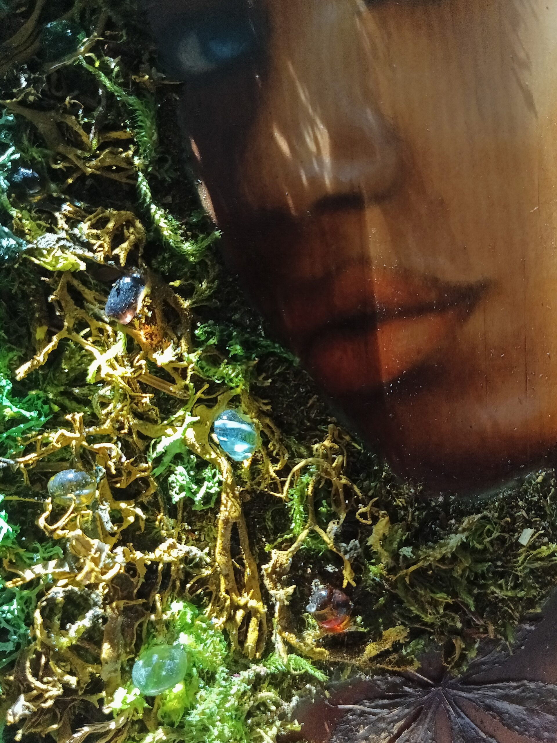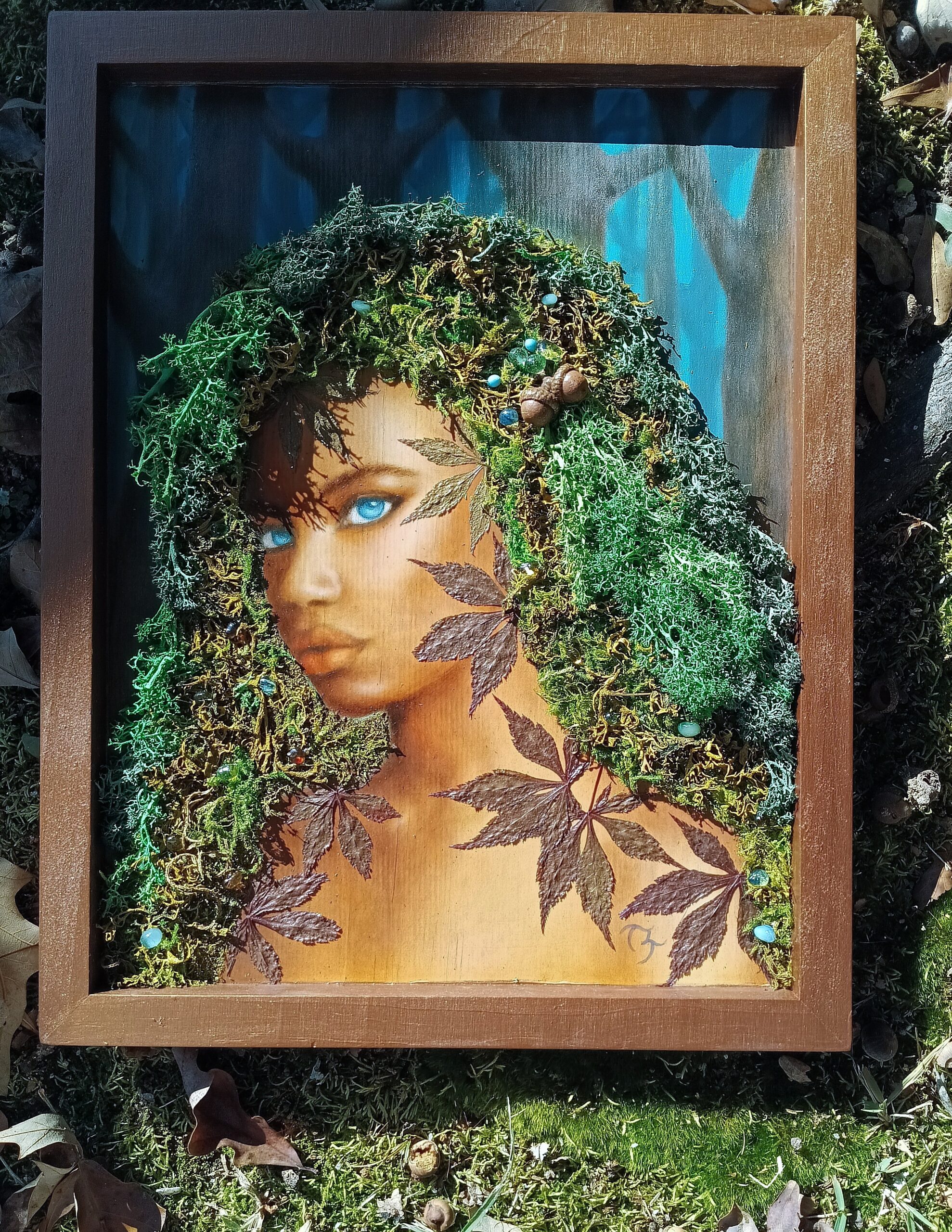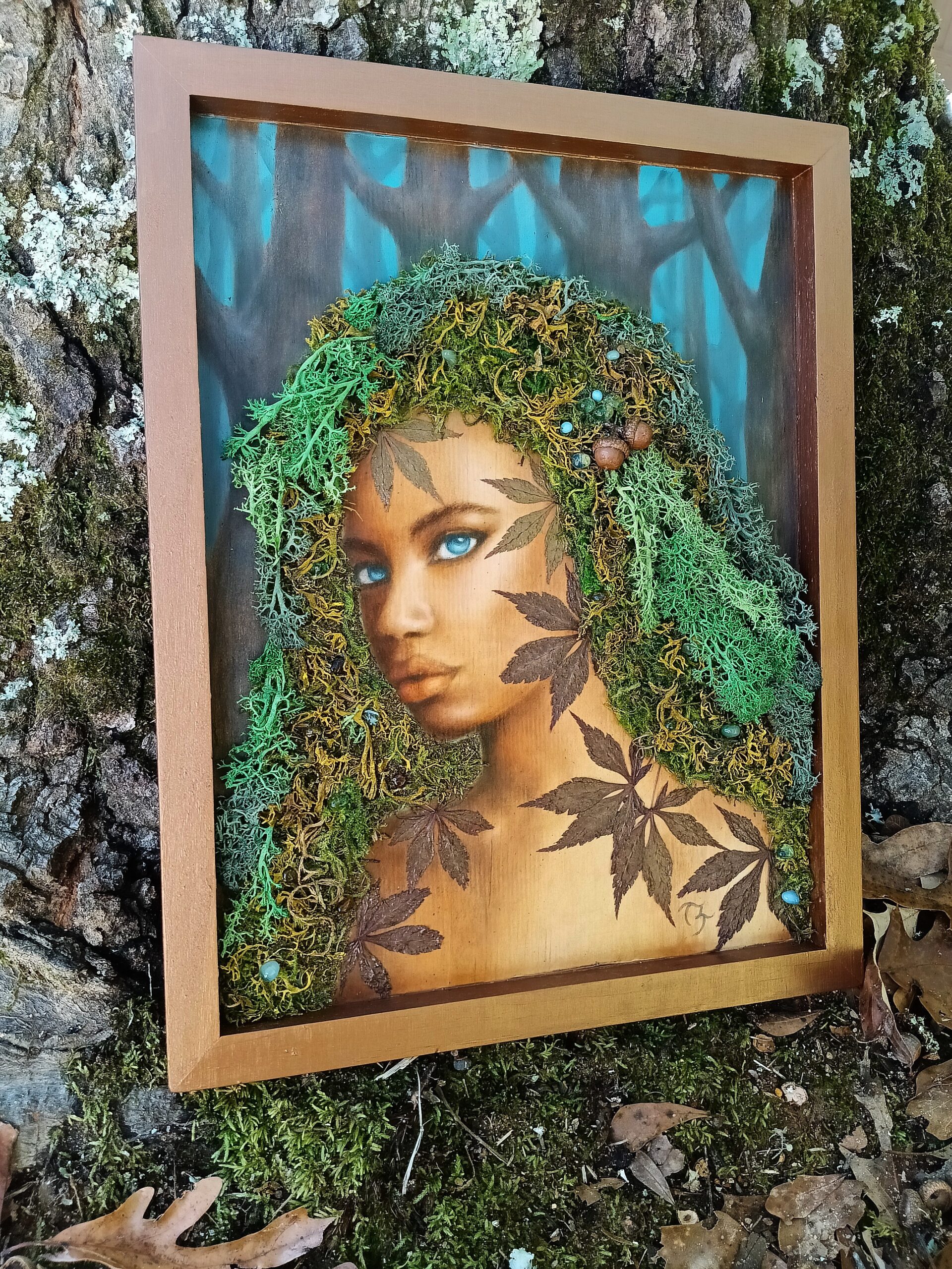 Gaia’s Daughter pays homage to the spirit of Mother Earth. I’ve always felt very protective of her so I often create artwork in her honor. She is painted in oils on an 11″ x 14″ cradled wood panel with 5/8″ depth, her skin is adorned with pressed leaves and her hair is made of organic preserved moss. I’ve added acorns from my oak tree and tumbled glass beads of green, blue and amber throughout the moss. The edges of the panel are painted with metallic bronze which provides a natural frame. This piece is wired and ready to hang!