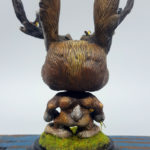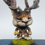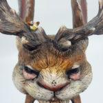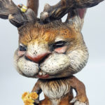 Medium: Jackalope and birds —Funko Pop! blank toy, epoxy clay, wire, taxidermy eyes, acrylic paint. Other: paper flowers, base, flocking, acrylic paint.