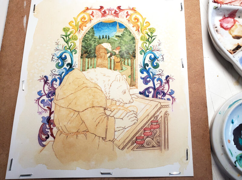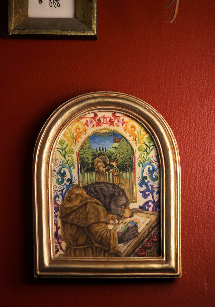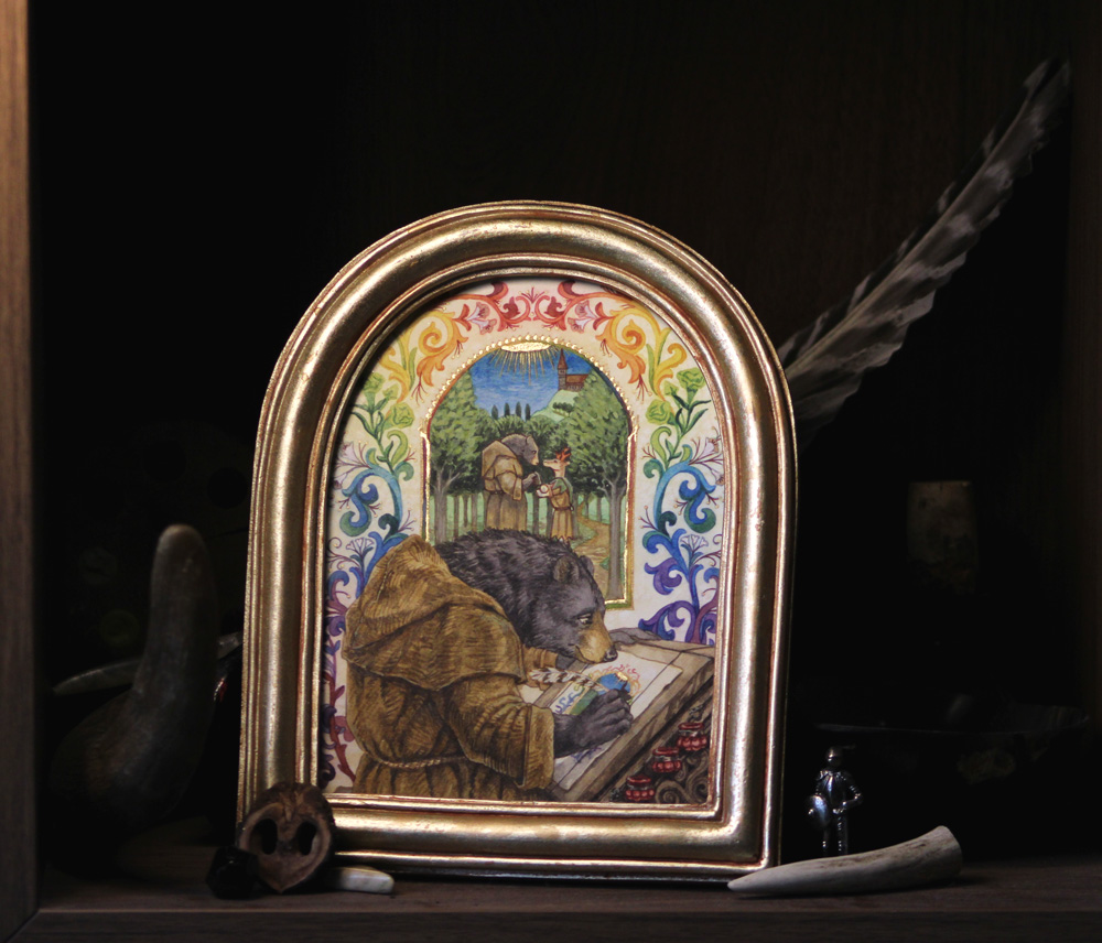 He works primarily in ink, watercolor and gouache (often embellished with metal leaf), creating pieces inspired by folklore, history, and nature.