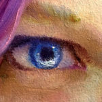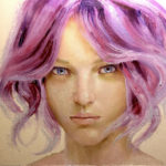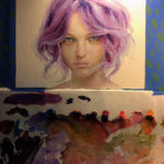 This is a 9.5 x 7″ oil on board of this Girl with Lavender hair. I have an upcoming project with lots of interesting hair cuts and colors, this was practice learning how to control lavender hair. This was done with a full color palette and no mediums were used. The painting is slightly cooler than the photos depict.