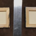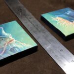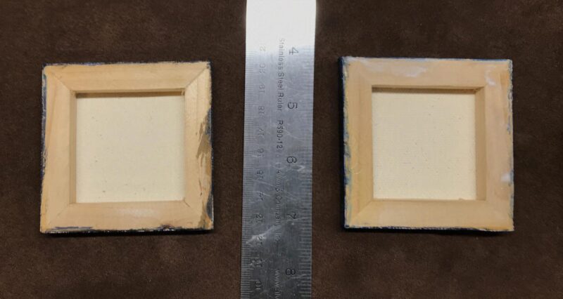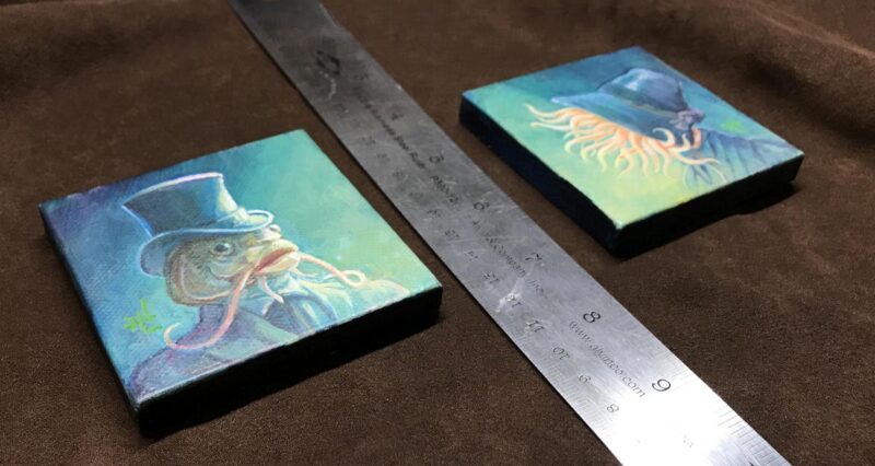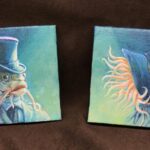 Offered as a set, this artwork consists portraits of a Deep One couple in 19th century dress.  The portraits are painted in acrylic on stretched 3” x 3” cavasses, and are 3/8″ deep.  I will write the title and artist’s name on the back, on the stretcher bars, before shipping.